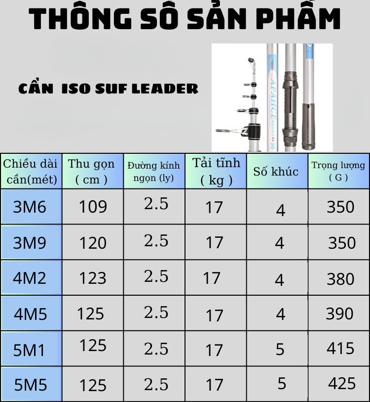 Chiều dài Thu gọn Đường kính ngọn Tải Số khúc Trọng lượng 3m6 109cm 2.5mm 17kg 4 350g 3m9 120cm 2.5mm 17kg 4 350g 4m2 123cm 2.5mm 17kg 4 380g 4m5 125cm 2.5mm 17kg 4 390g 5m1 125cm 2.5mm 17kg 5 415g 5m5 125cm 2.5mm 17kg 5 425g