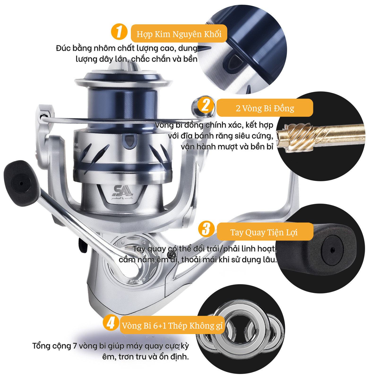 Máy câu Samola có đủ các size từ 1000 – 7000, phù hợp cho mọi phong cách câu: từ câu sông, câu hồ, đến câu biển gần bờ.
