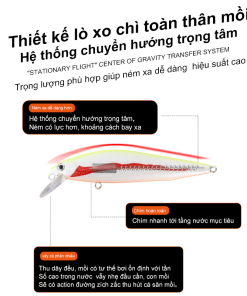 Trọng lượng mồi được phân bổ hợp lý giúp mồi bay xa và đạt đến tầng nước mục tiêu nhanh chóng.